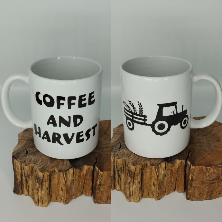 Taza blanca con dibujo en negro de un tractor y la frase: Coffee and Harvest (Café y a cosechar). Diseño sublimado apto para lavavajillas y microondas. Capacidad de 350ml.